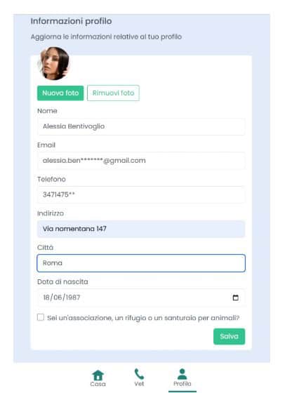 Completa il tuo profilo con email, numero di telefono e città: il veterinario potrà ricontattarti per confermare la visita, e tu vedrai subito tutti i servizi disponibili nella tua zona. Più utenti si registrano in una città, prima arriviamo con la nostra rete di veterinari e convenzioni veterinarie.