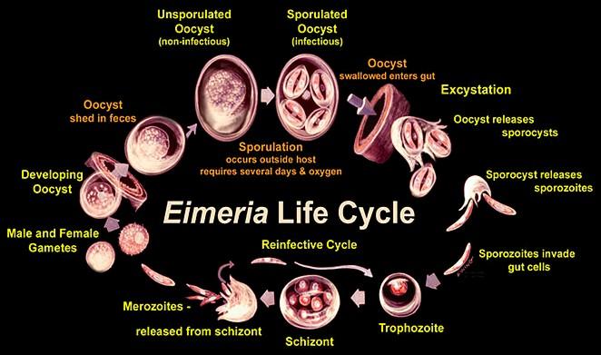Nel momento in cui il cane ingerisce le uova larvate dai coccidi presenti nell’ambiente in cui un animale infetto ha defecato, le uova si schiuderanno e le larve infesteranno l’intestino. Distruggeranno le cellule dell’intestino e si moltiplicheranno producendo nuove uova larvate che saranno espulse con le feci nell’ambiente esterno e il ciclo si ripeterà su un altro animale che le ingerirà. Il ciclo della coccidiosi dura in media da 1 a 4 settimane.